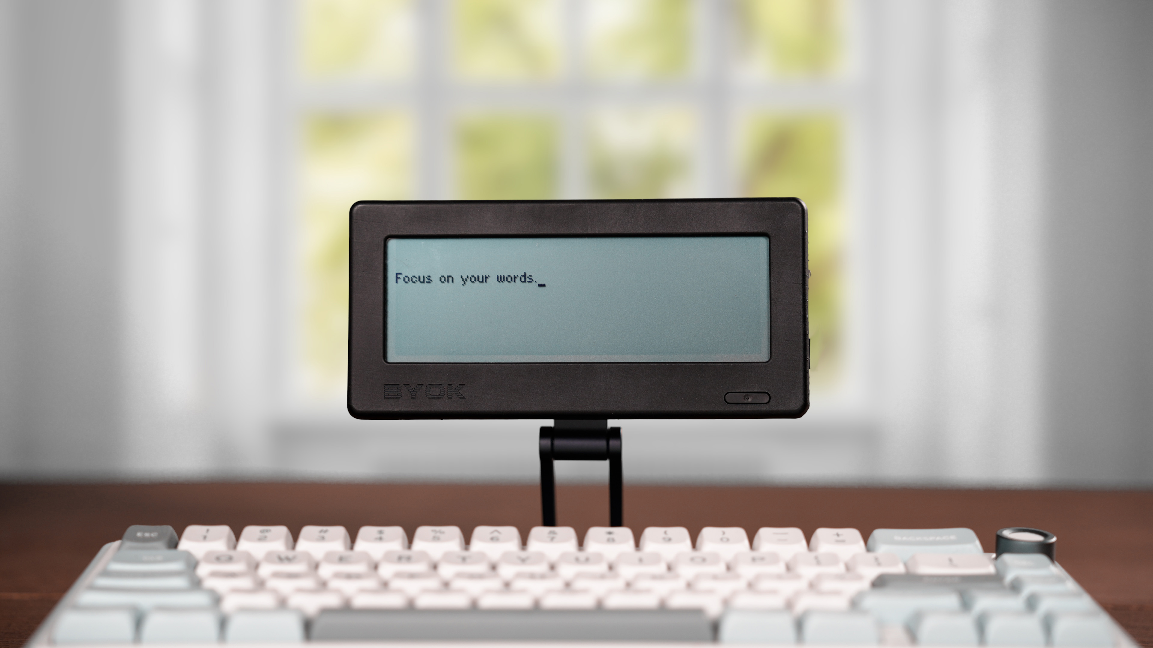 BYOK is a focused writing device that pairs with your favorite keyboard, eliminating apps and notifications to create a space just for writing. Your drafts sync seamlessly to the companion Studio app for organizing and refining when inspiration strikes.